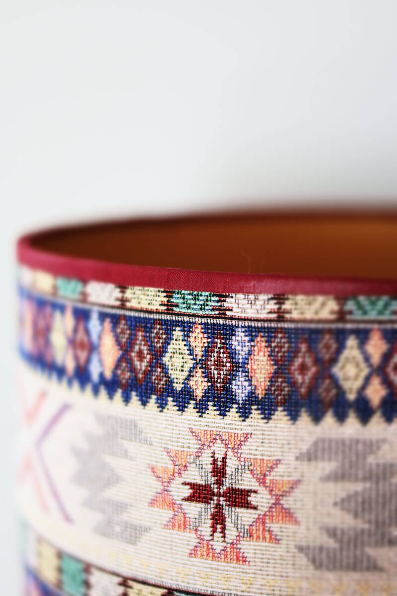 Handgemaakte lampenkap in stof met Egyptische print , afgewerkt met een bordeaux rand. De rand is mogelijk in verschillende kleuren, zodat je de kap naar wens kunt samenstellen.